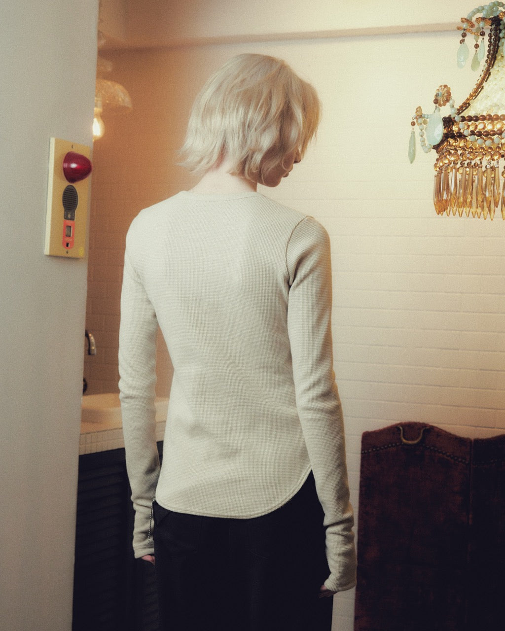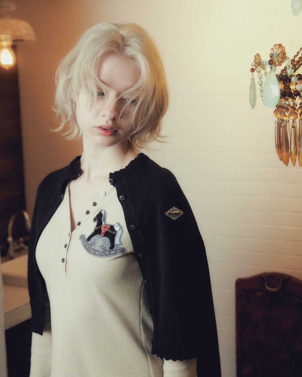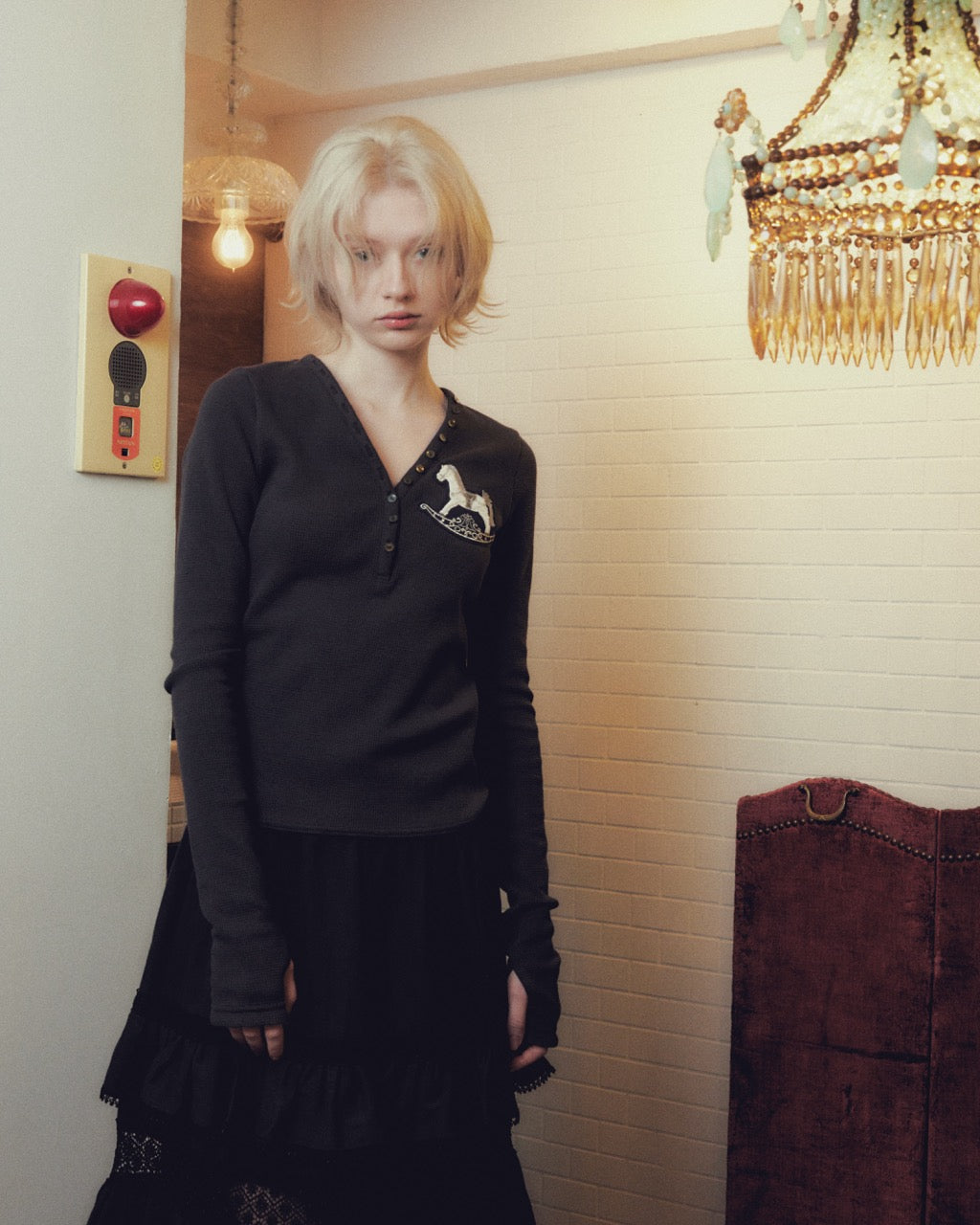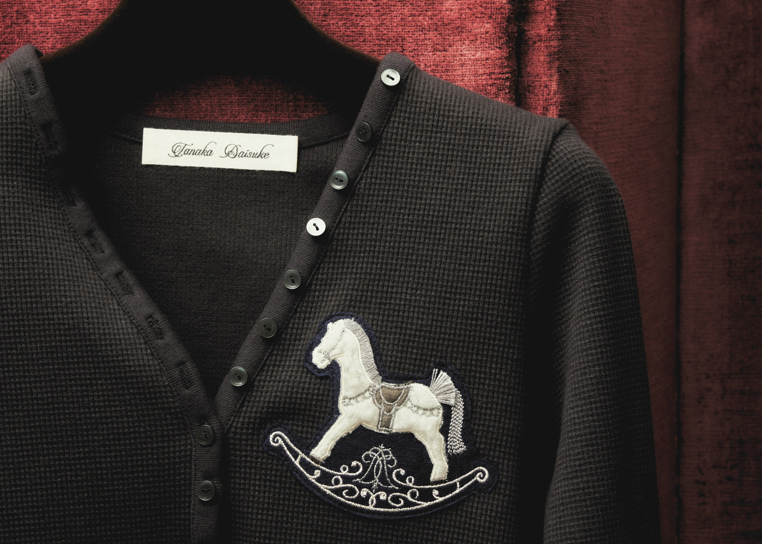 ビーズが散りばめられたrocking horseの刺繍モチーフには、イニシャルのTとDを重ね、街灯やランプシェードを連想させるデザインとして生まれたロゴマークが隠れています。新たに生まれたこのロゴマークには、ラテン語で光を意味する"Lumen"と名づけられています。