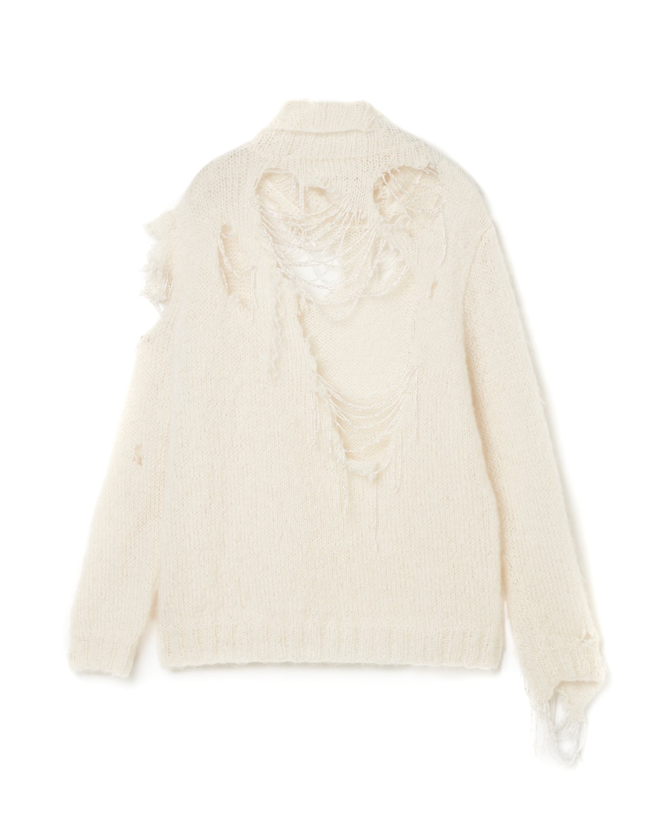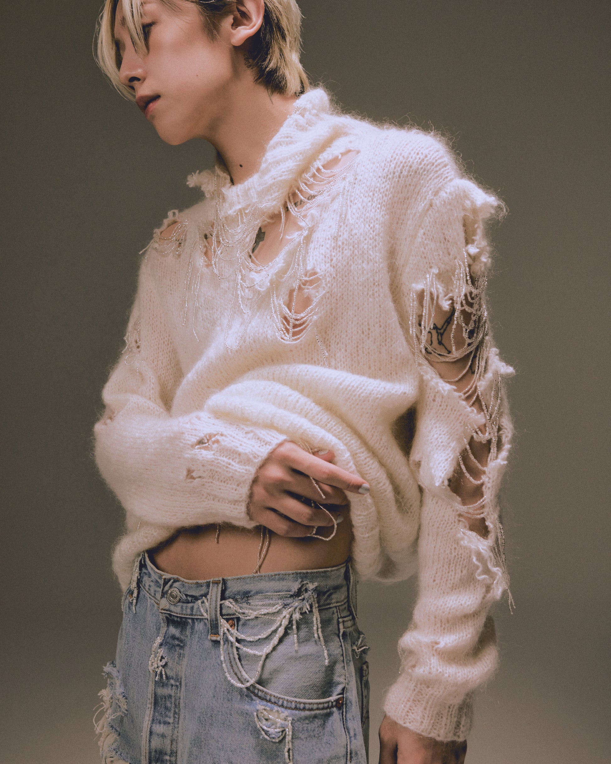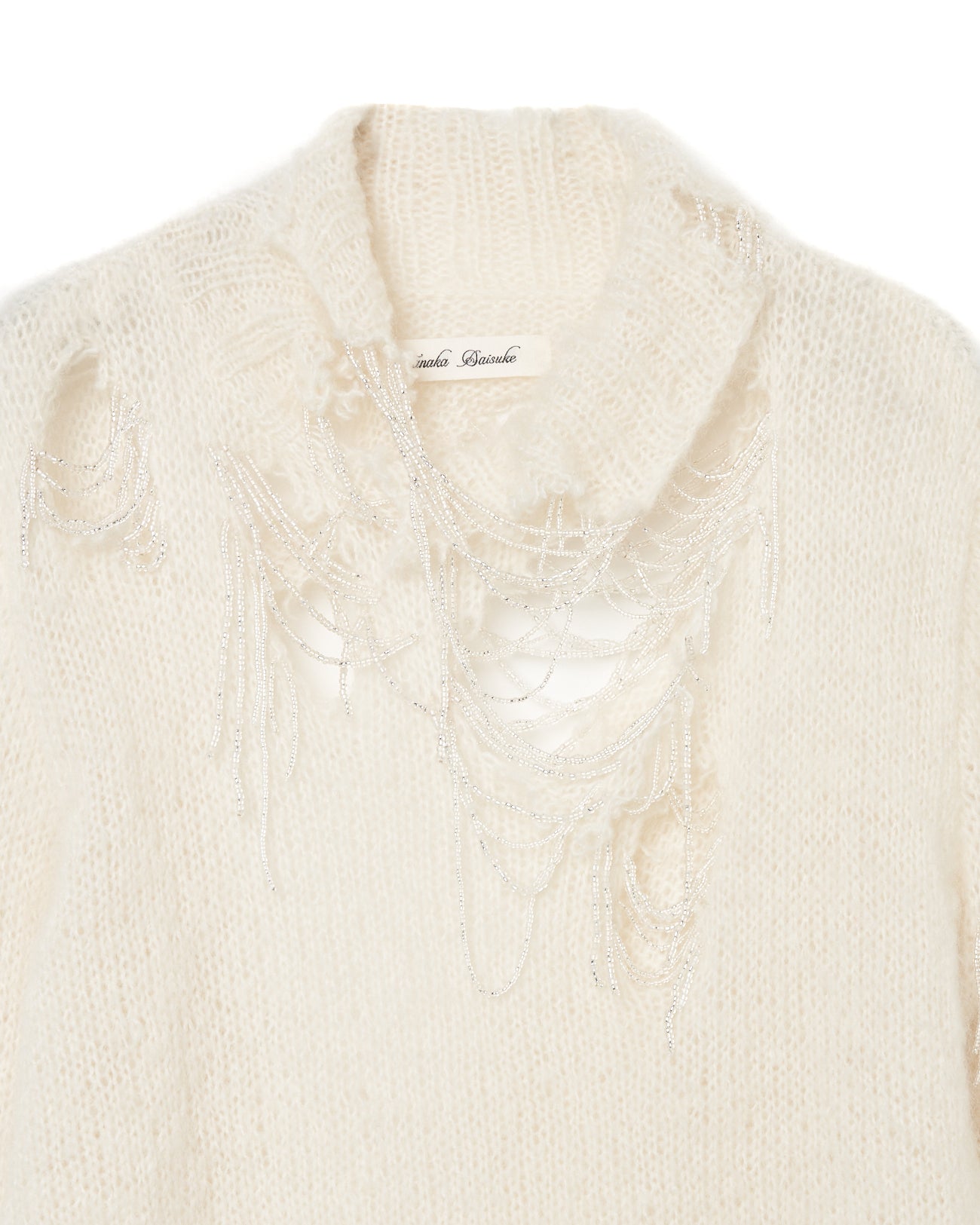 ・柔らかな風合いのモヘアニットにダメージを加え、ビジューのフリンジを紡ぎました。
