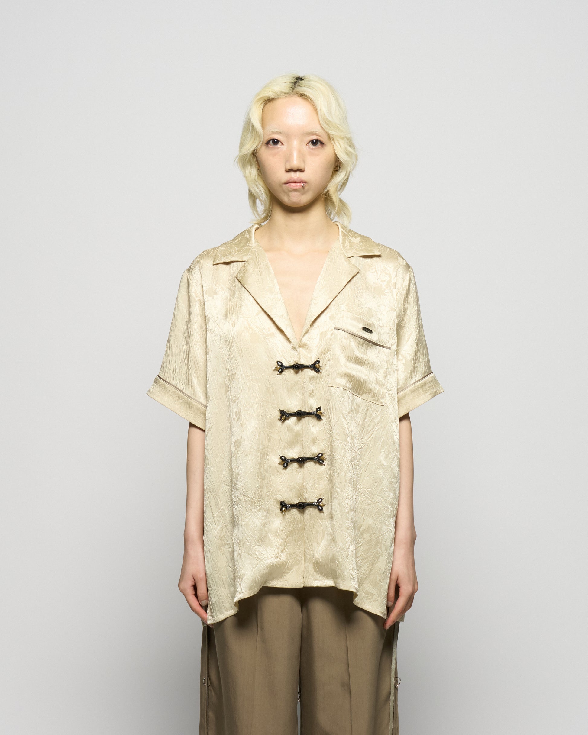 ・ボタニカル柄のサテンをオープンカラーのシャツに仕上げ、チャイナボタンでエキゾチックな雰囲気をプラス。