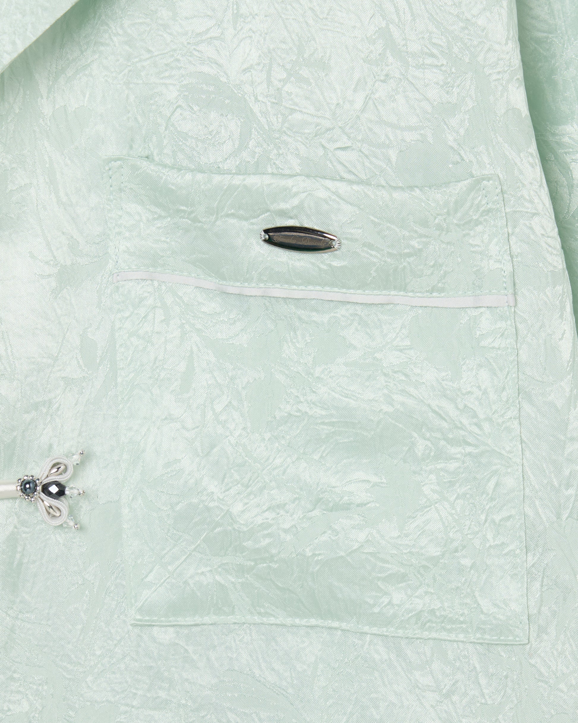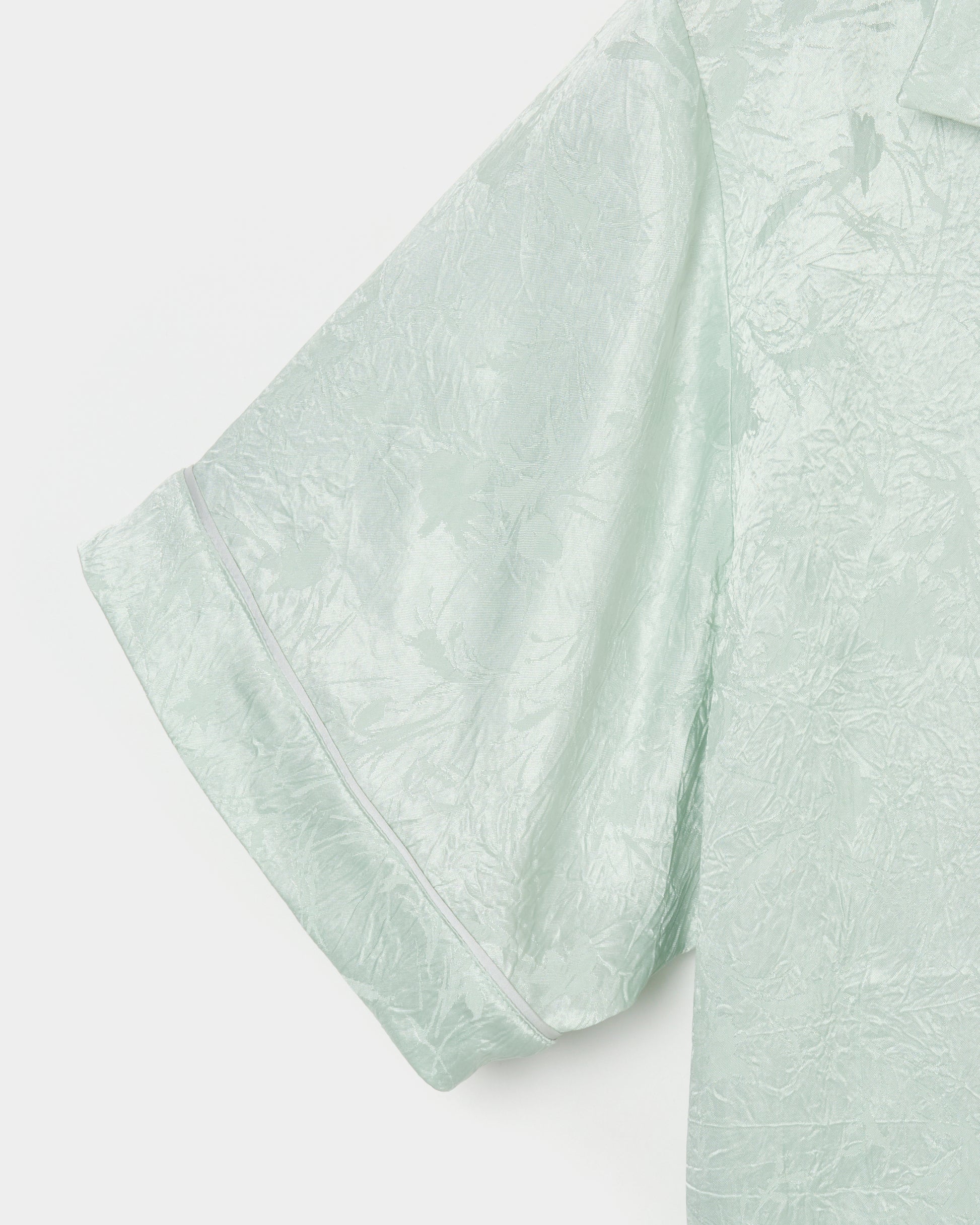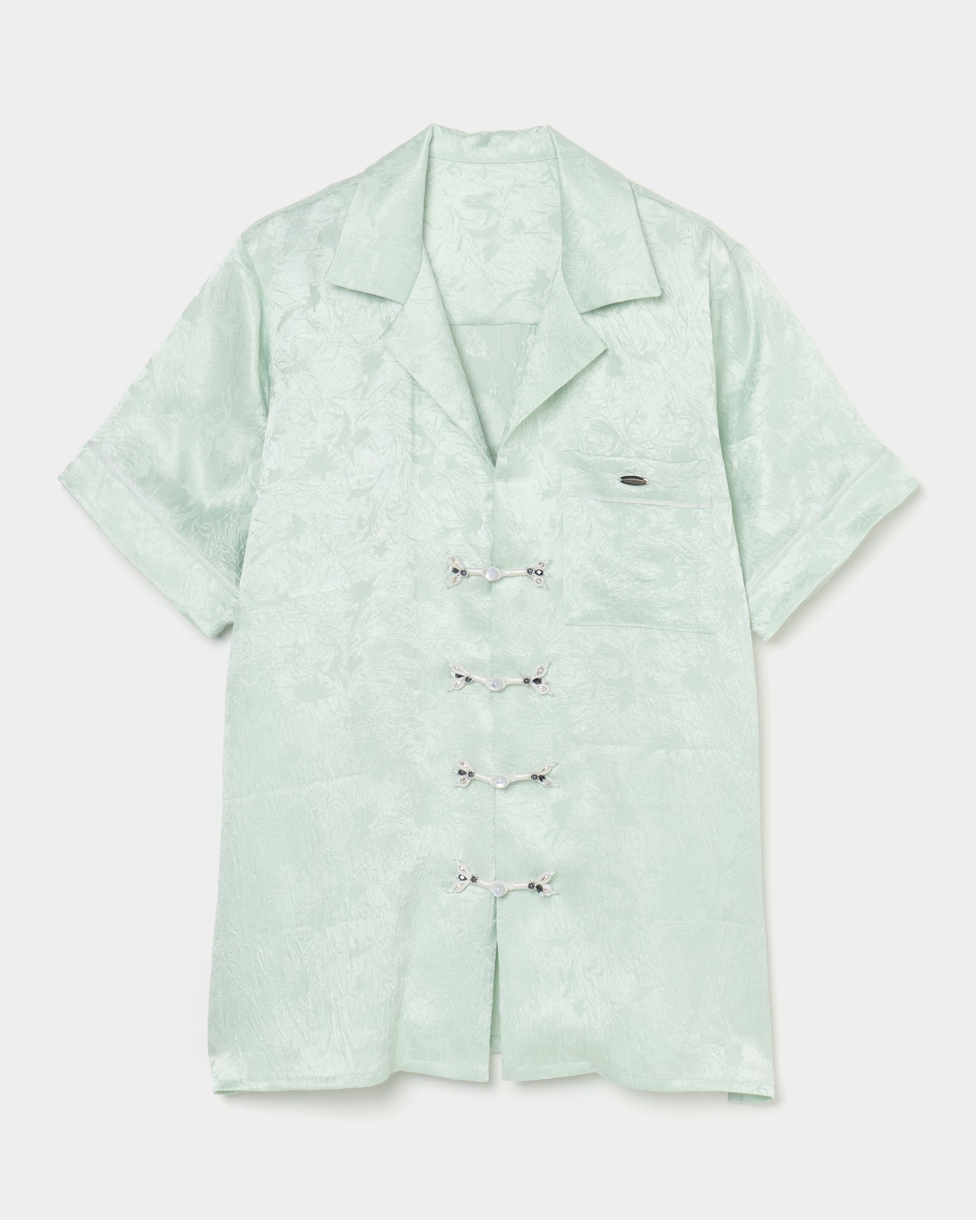 ・ボタニカル柄のサテンをオープンカラーのシャツに仕上げ、チャイナボタンでエキゾチックな雰囲気をプラス。