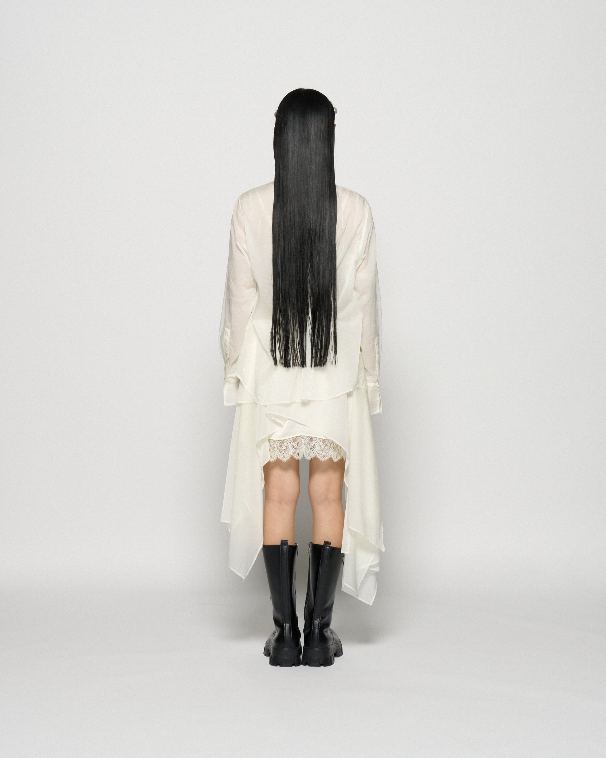 ・ミニスカートの土台にシアータフタを重ね、ランダムなヘムラインに仕上げました。