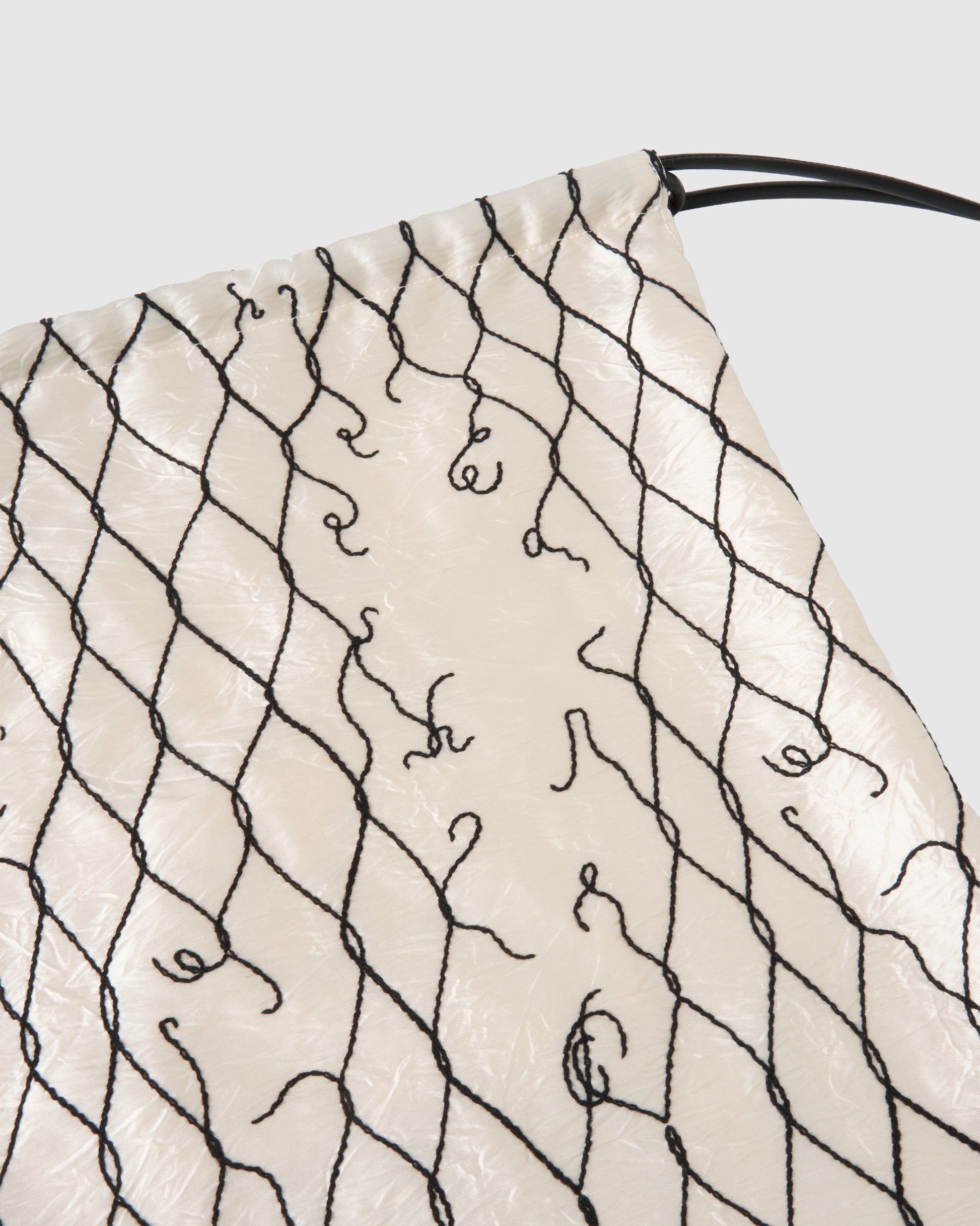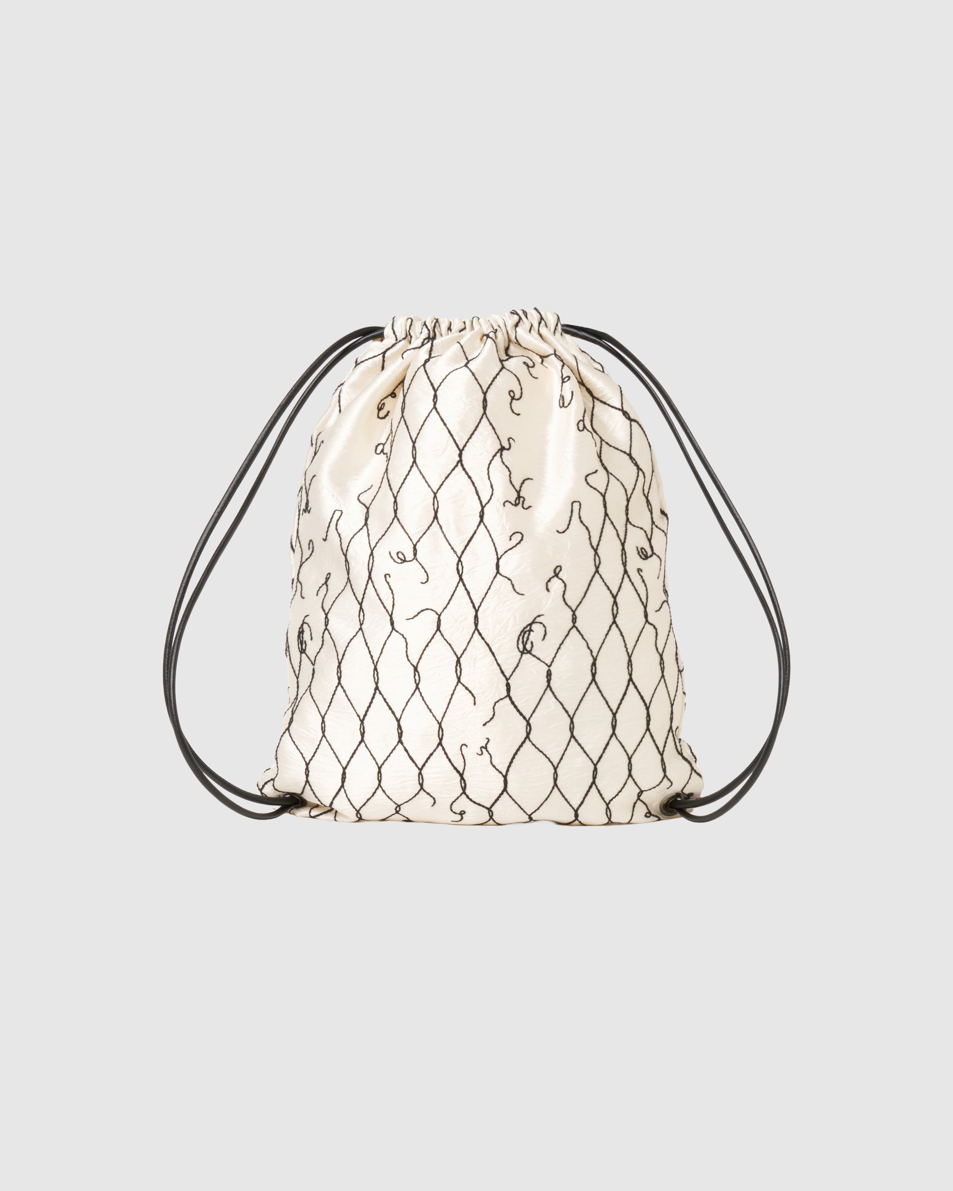 ・破れたフェンスを刺繍で再現したオリジナル生地で作られたバックパック。