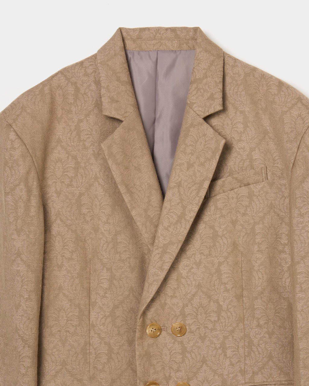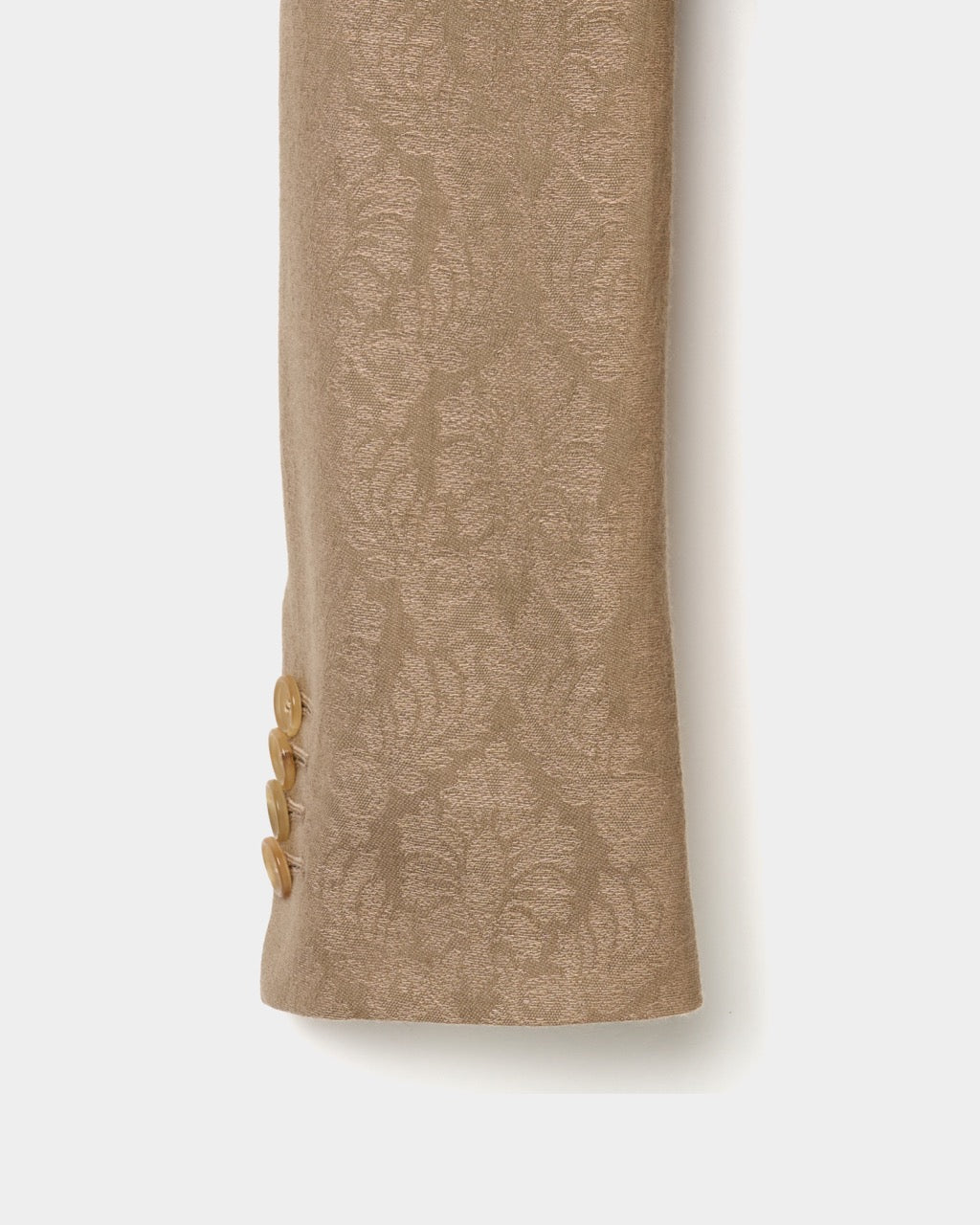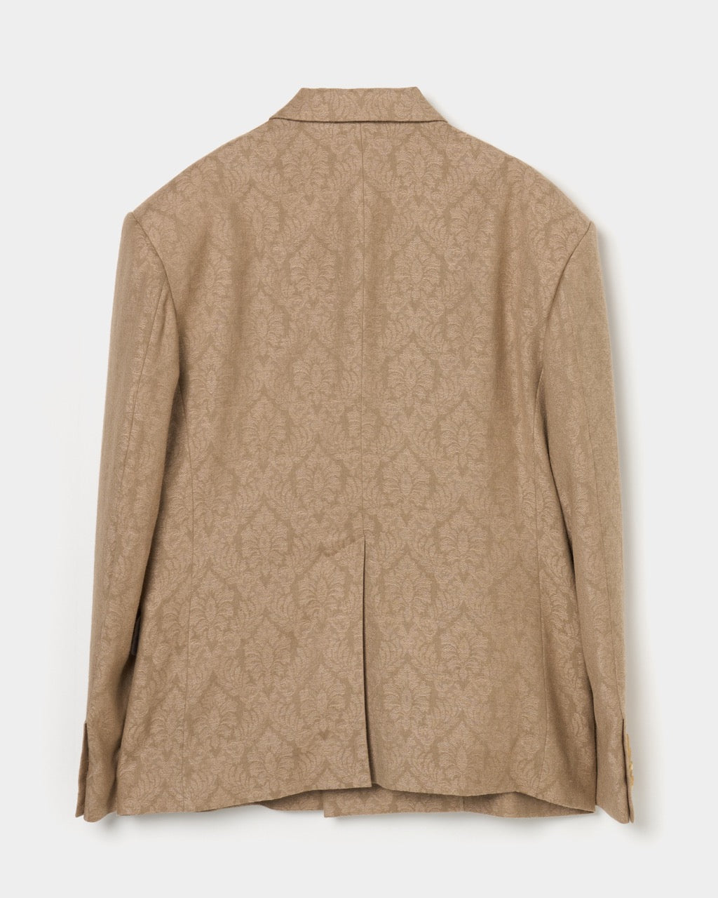 ・ダマスクパターンのデッドストック生地で仕立てられたタイトなダブルのジャケット。