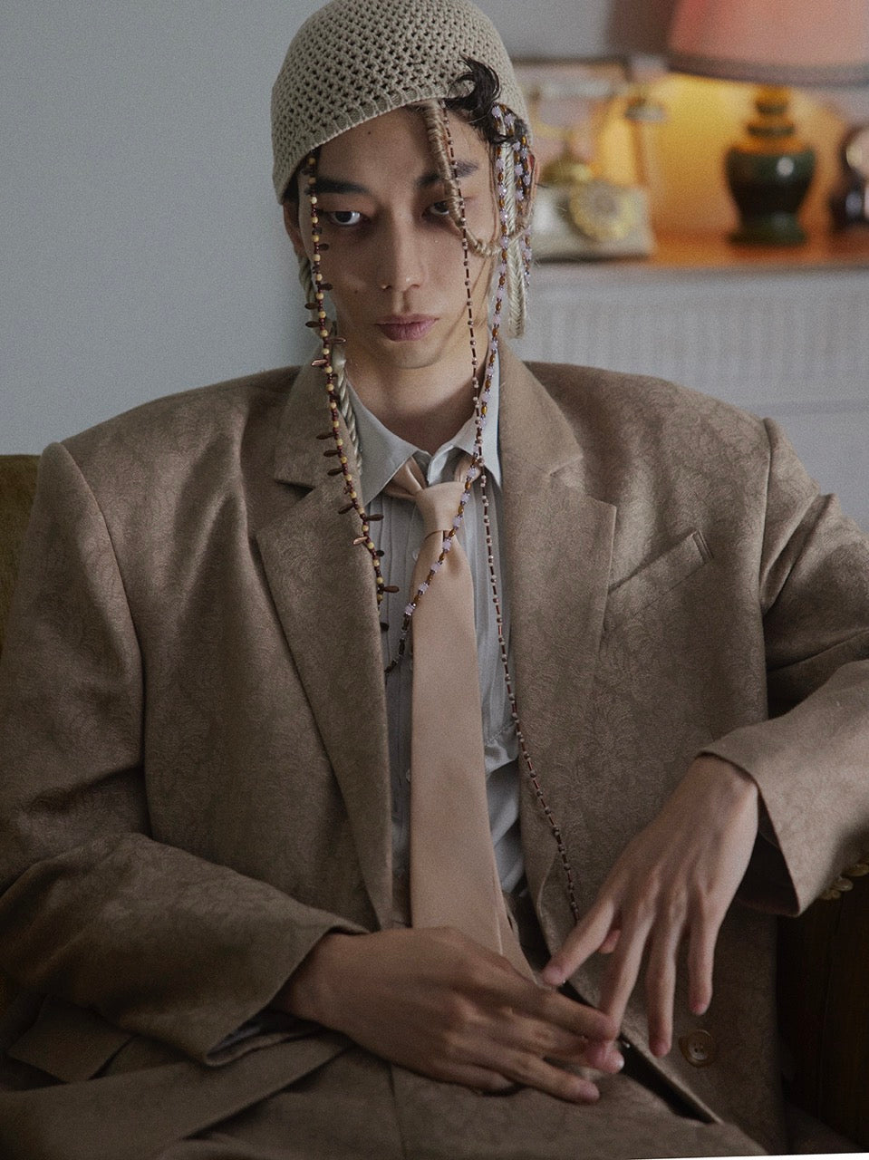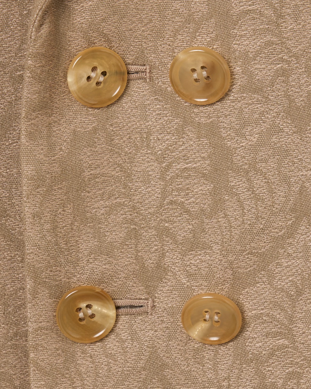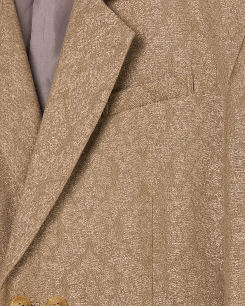・ダマスクパターンのデッドストック生地で仕立てられたタイトなダブルのジャケット。