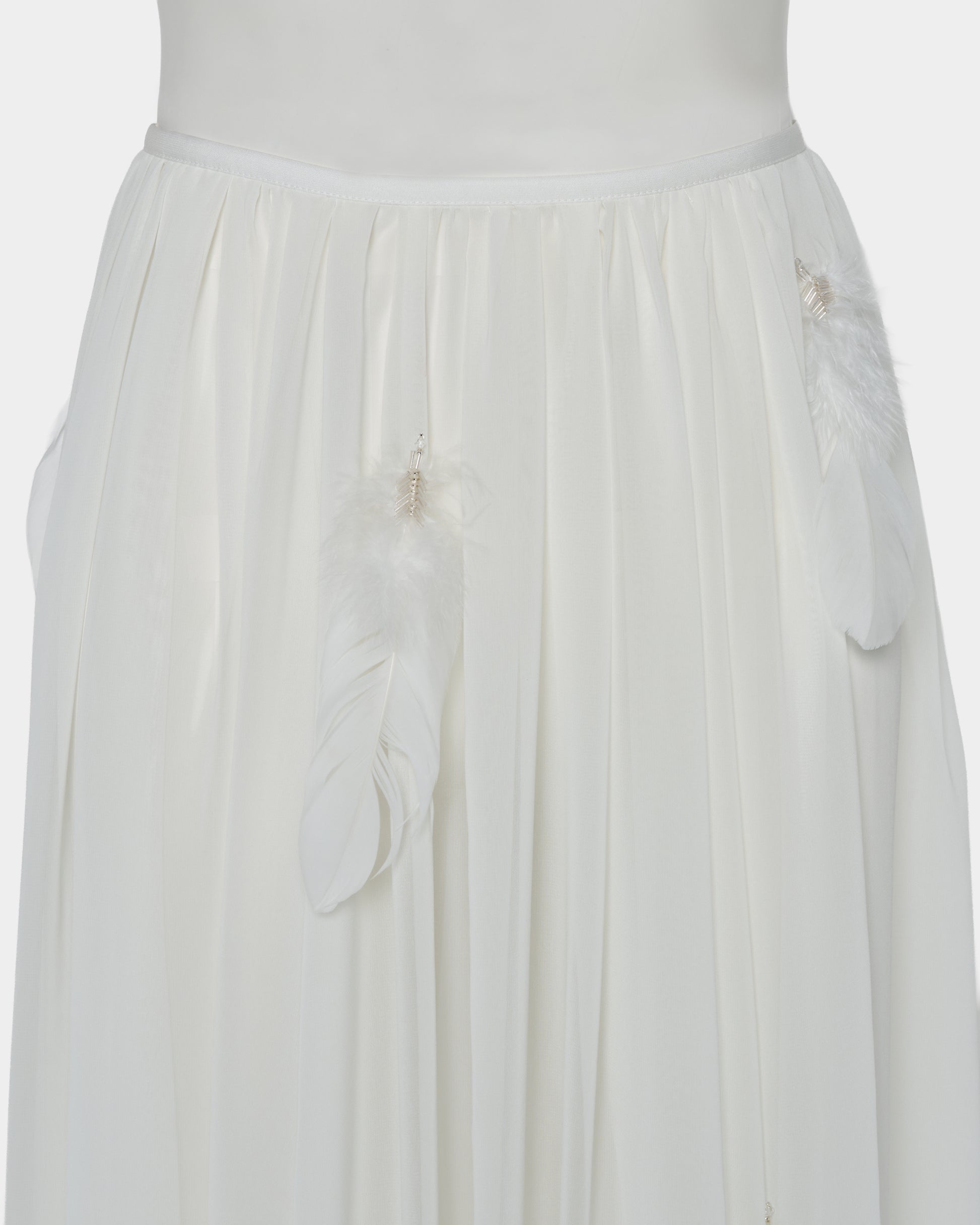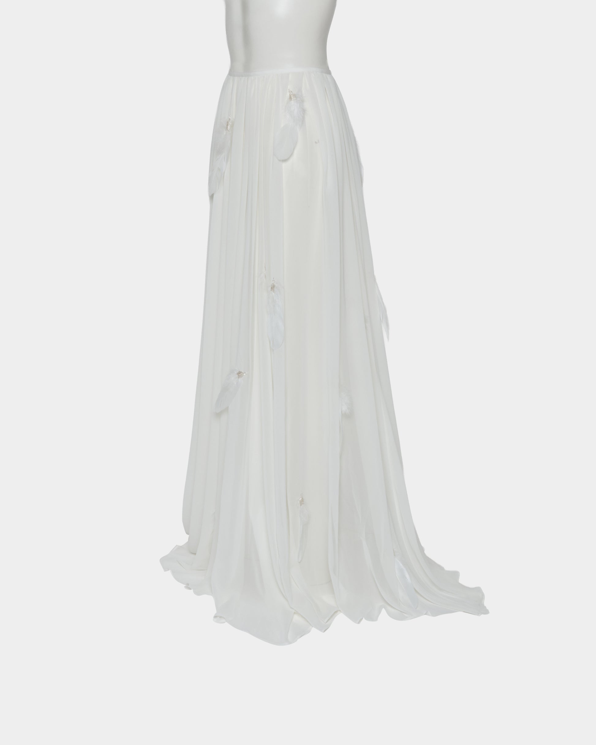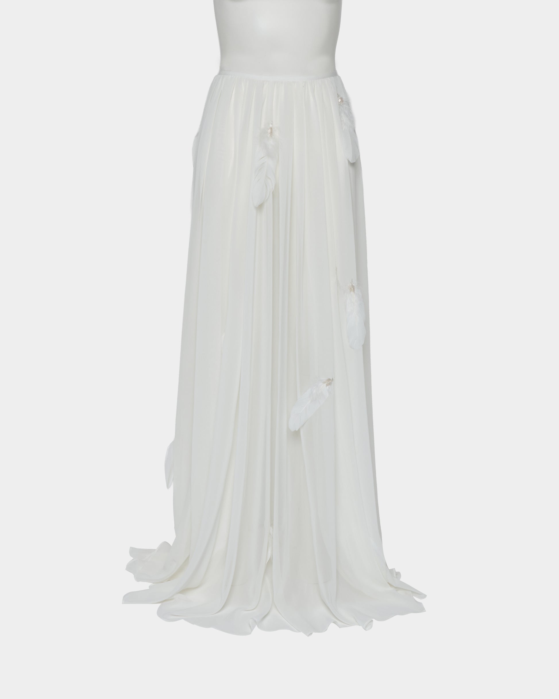 ・柔らかなシフォン生地にリアルフェザーをあしらったロングスカート。