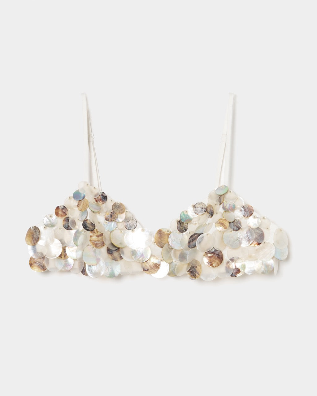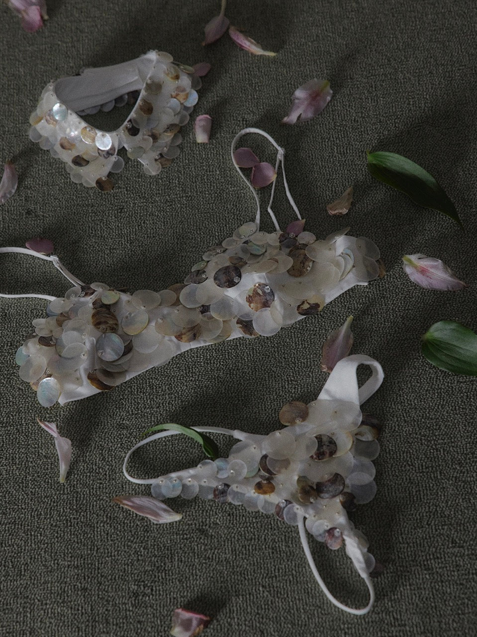 ・貝のビーズをモザイク柄に重ねて施したビキニセットアップ。
