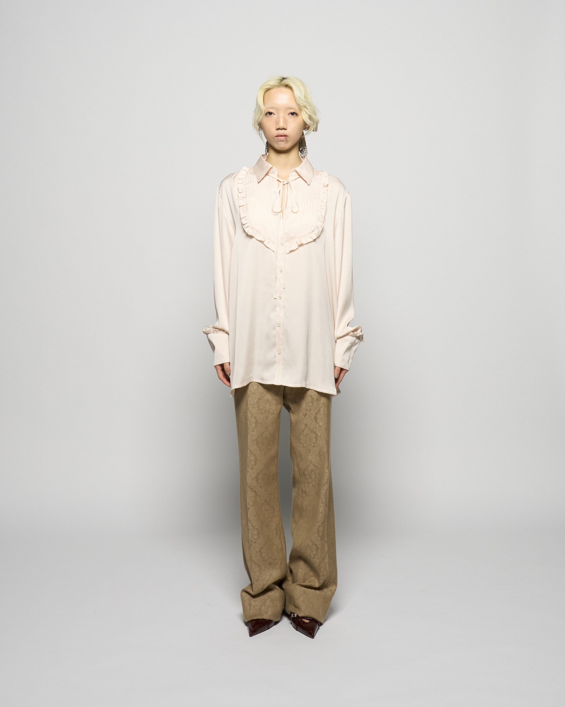 ・フロントパネルにピンタックとフリル、グログランテープをあしらったクラシックな印象のシャツ