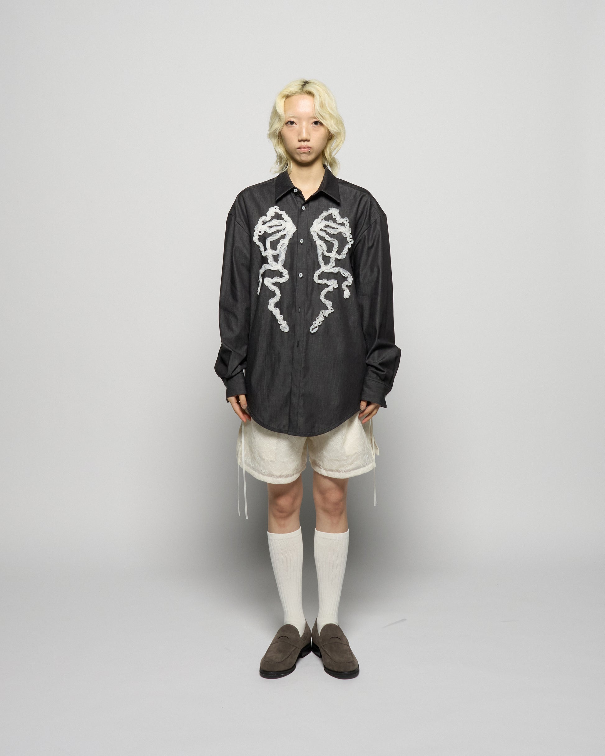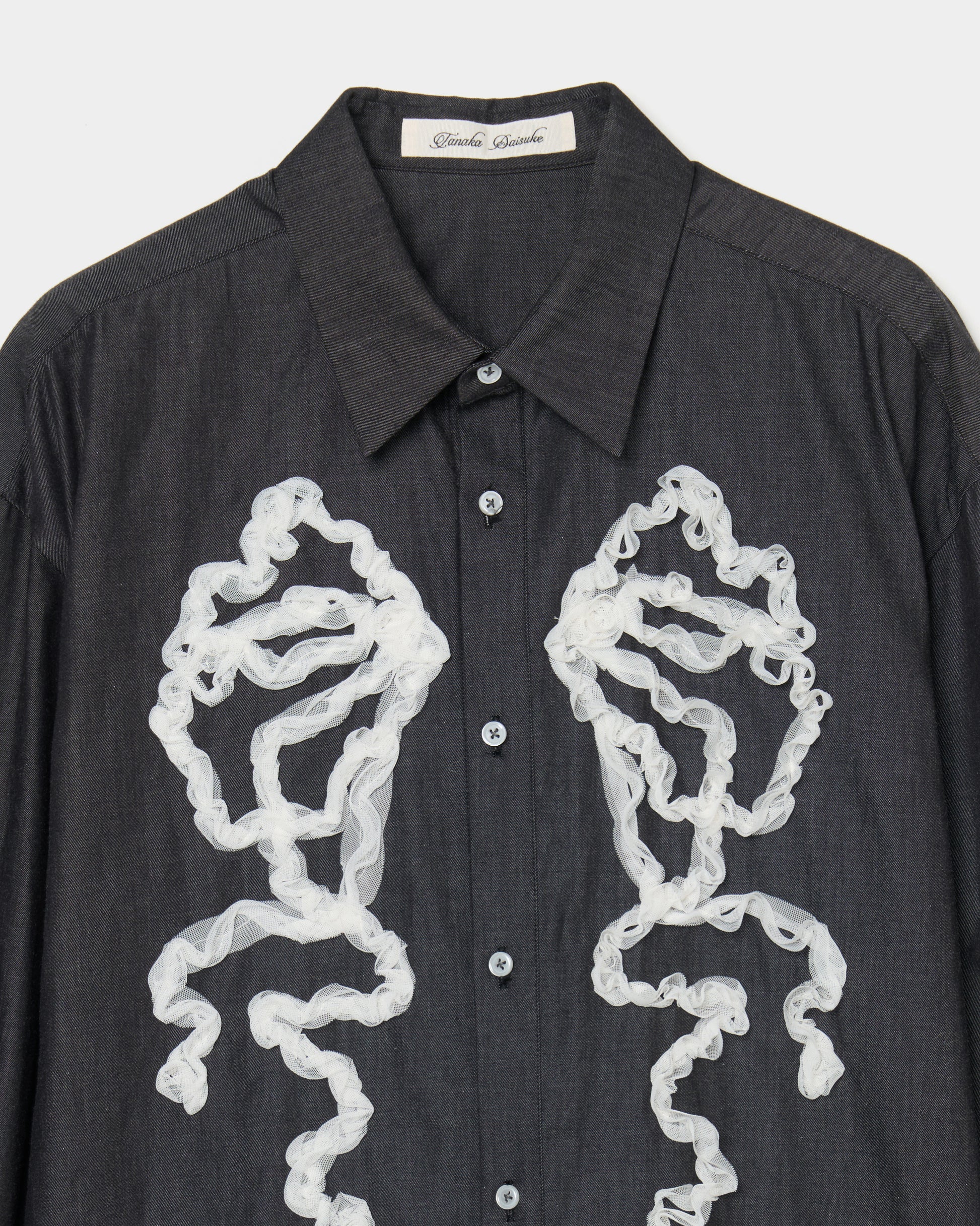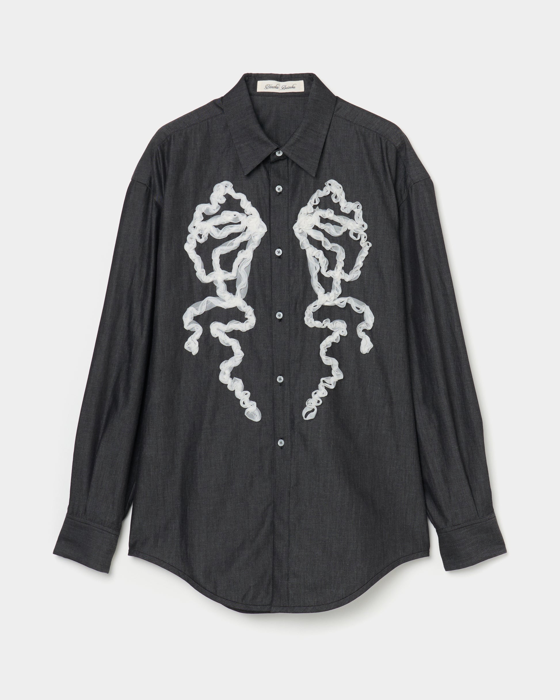 ・チュールのコード刺繍でリボンを模したコットン素材のシャツ。