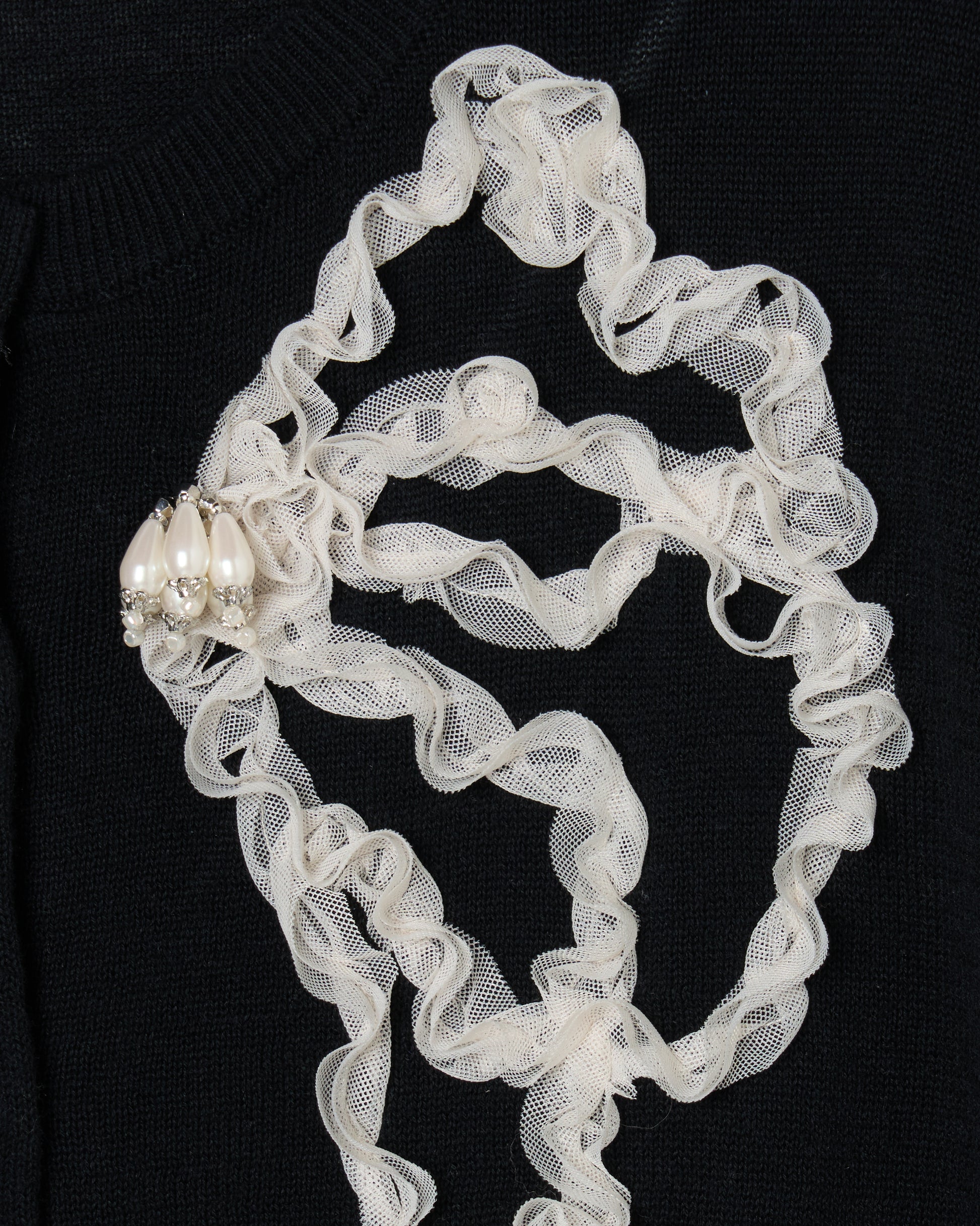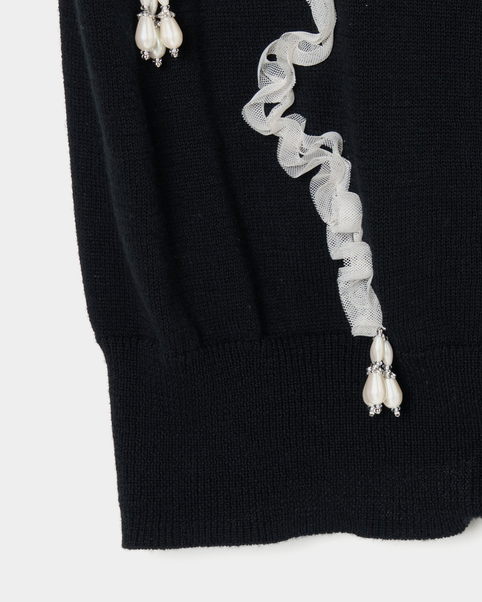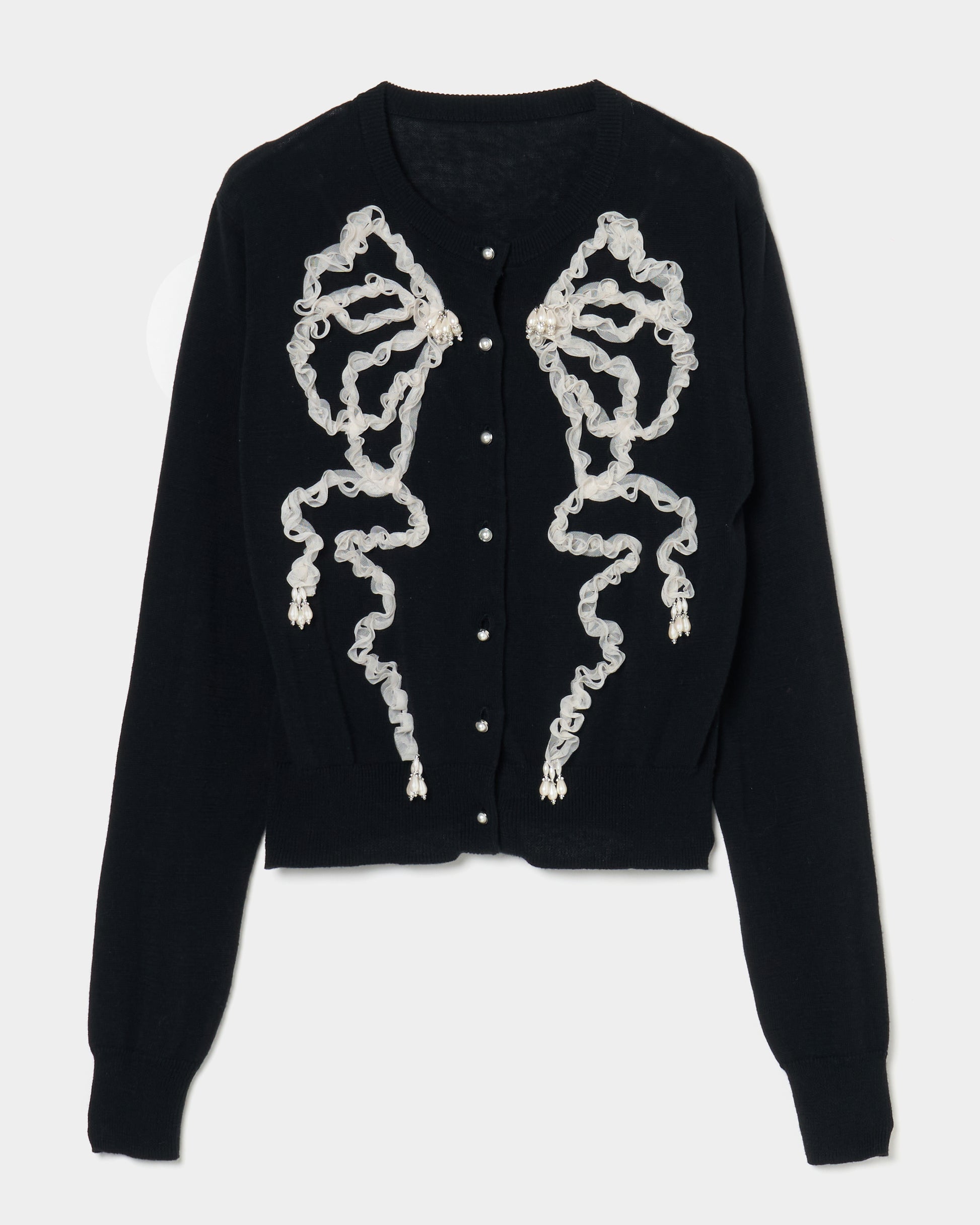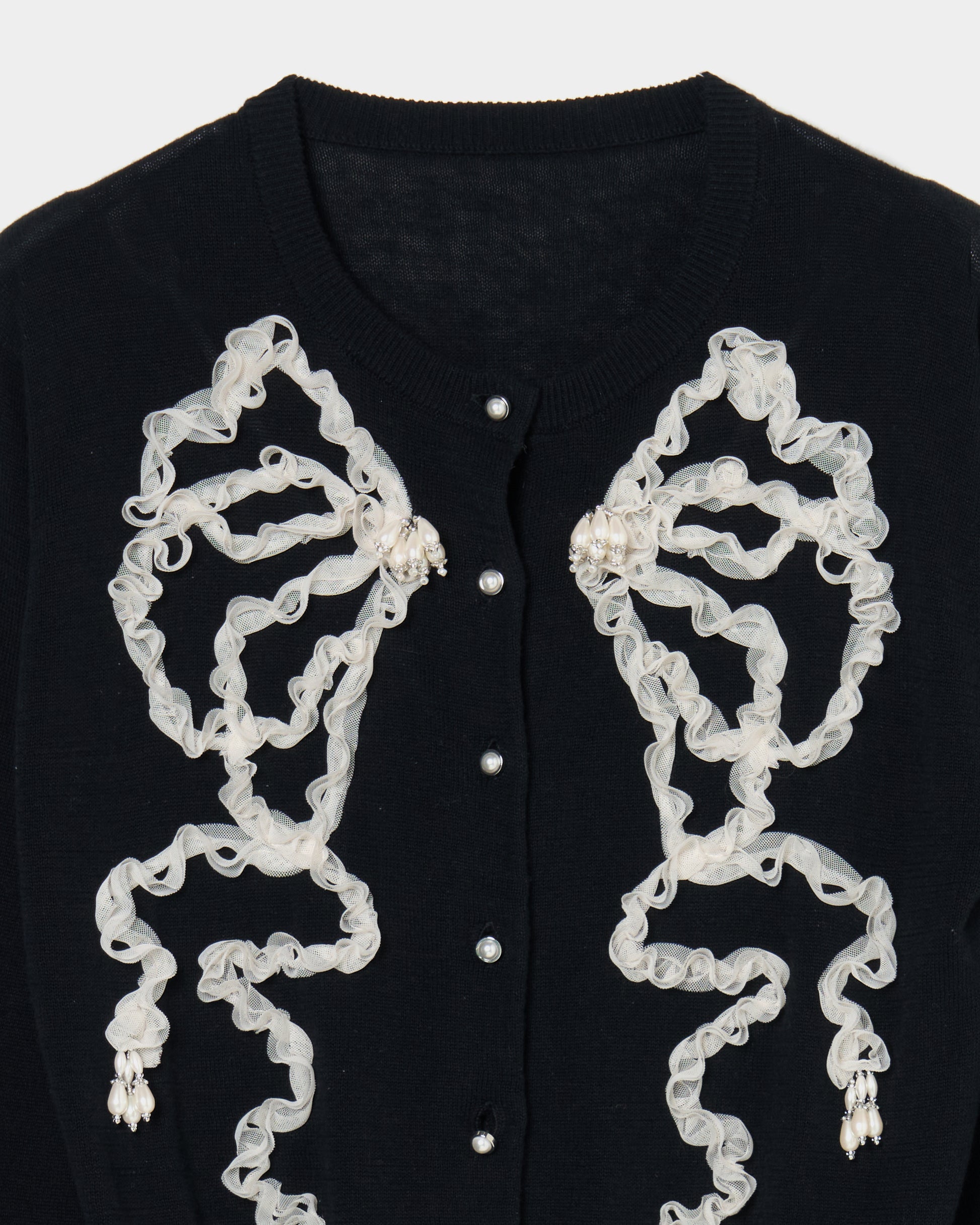 Ribbon tulle pearl embroidery cardigan Black【Delivery in February 2026】
