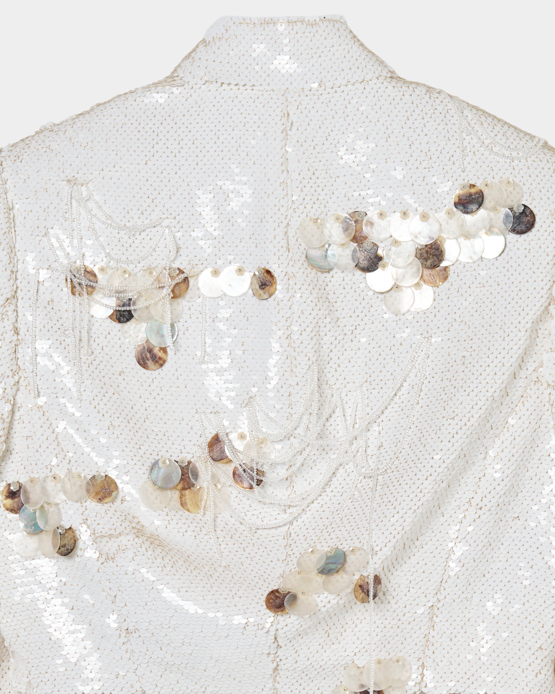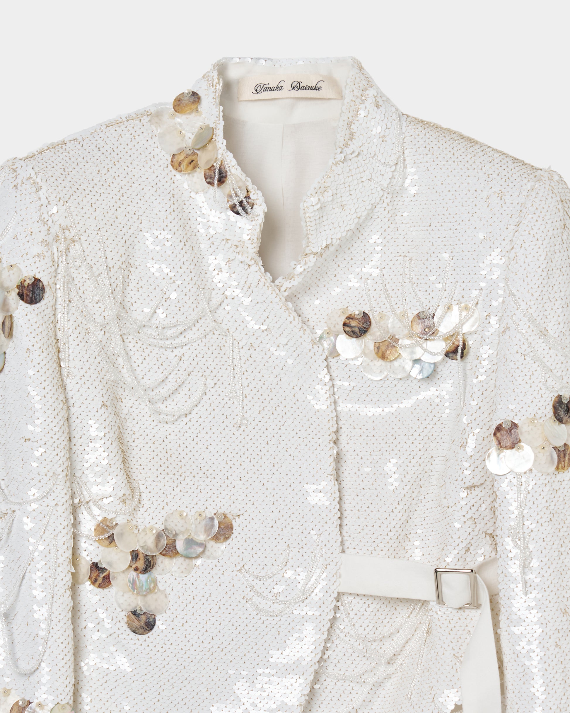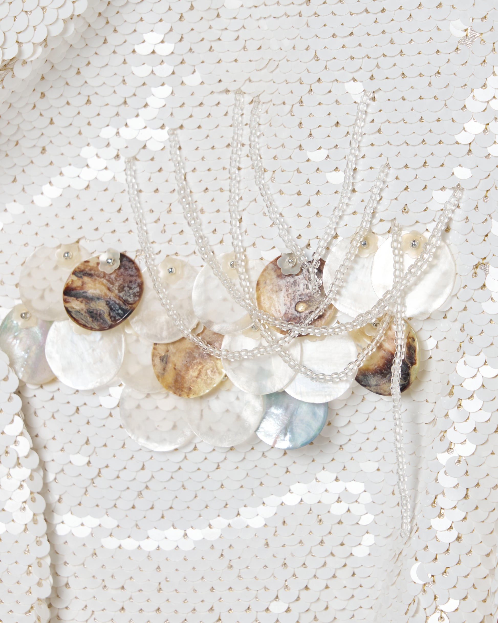 ・スパンコール生地から生える鱗のように散りばめたシェルビーズ。