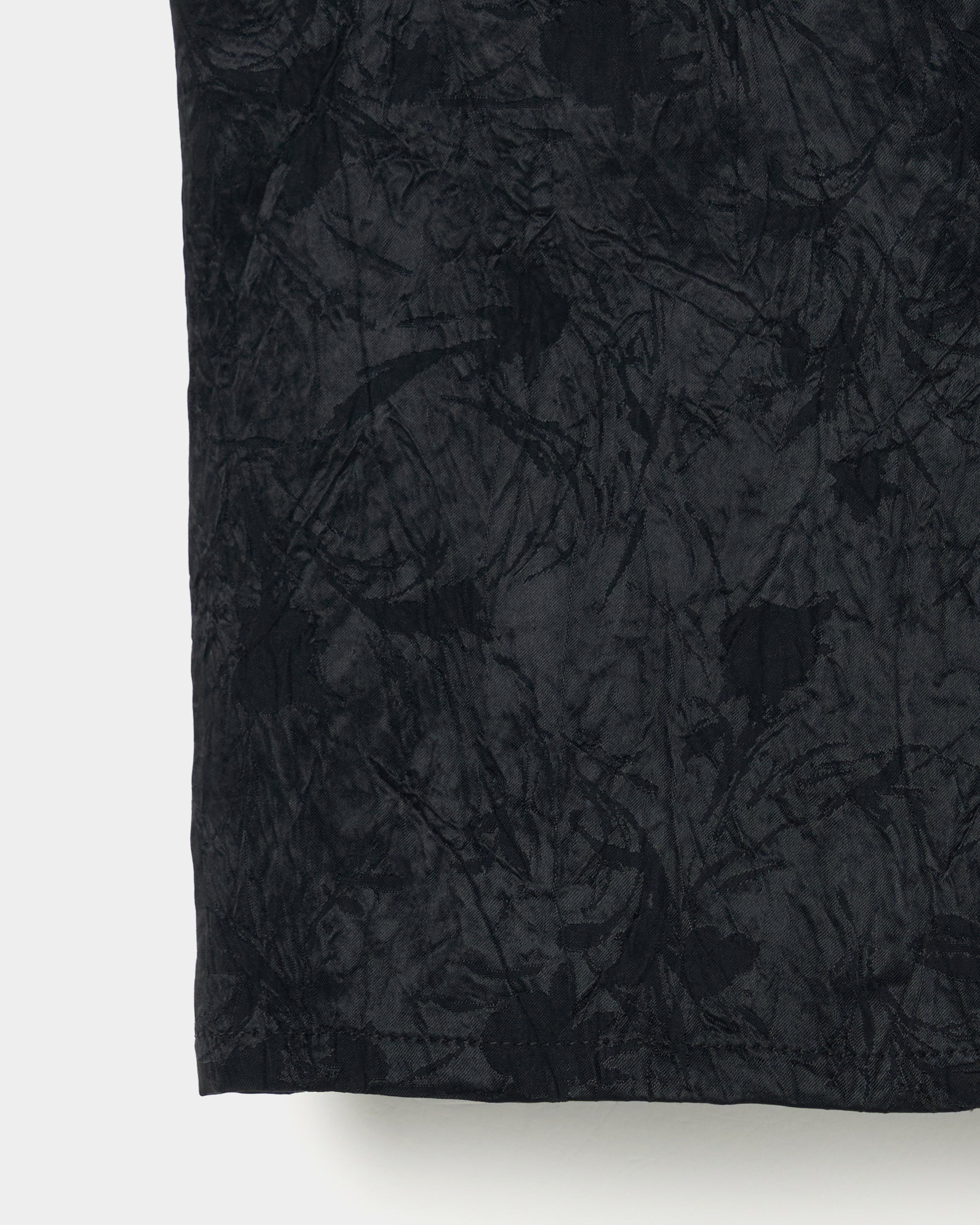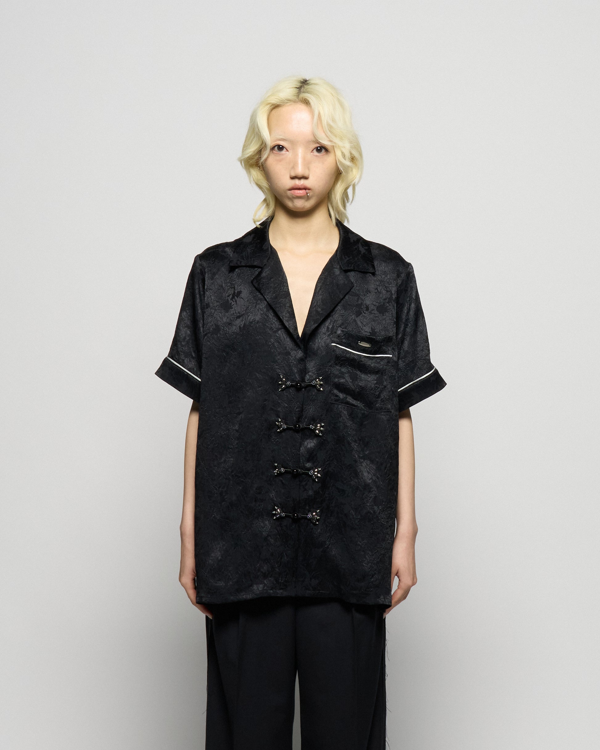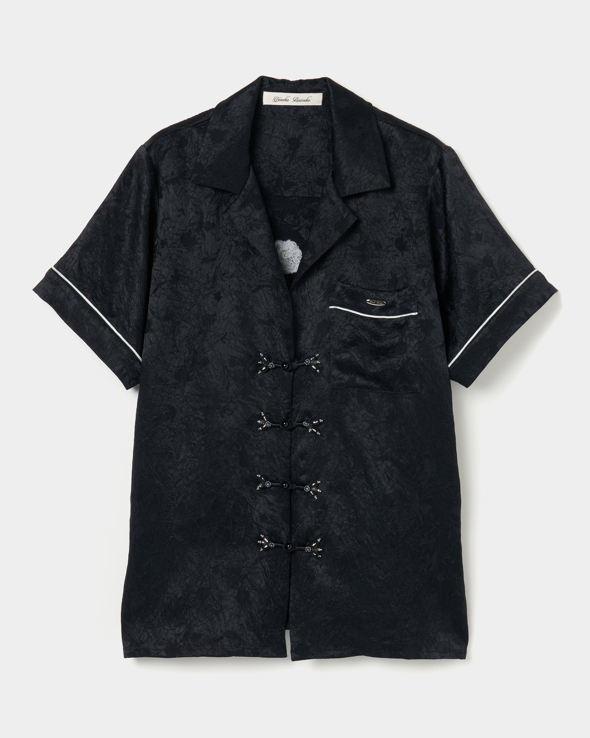 ・ボタニカル柄のサテンをオープンカラーのシャツに仕上げ、チャイナボタンでエキゾチックな雰囲気をプラス。