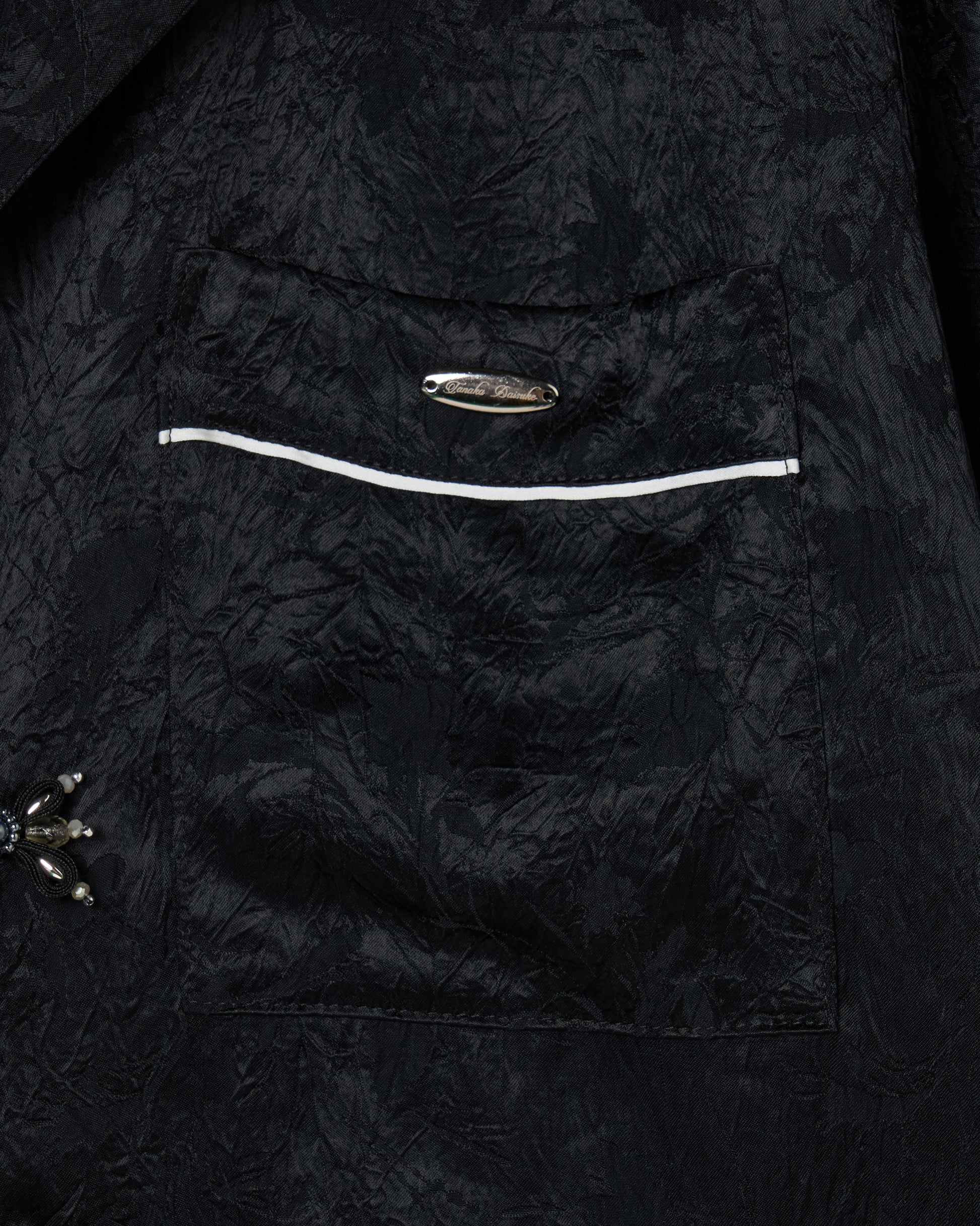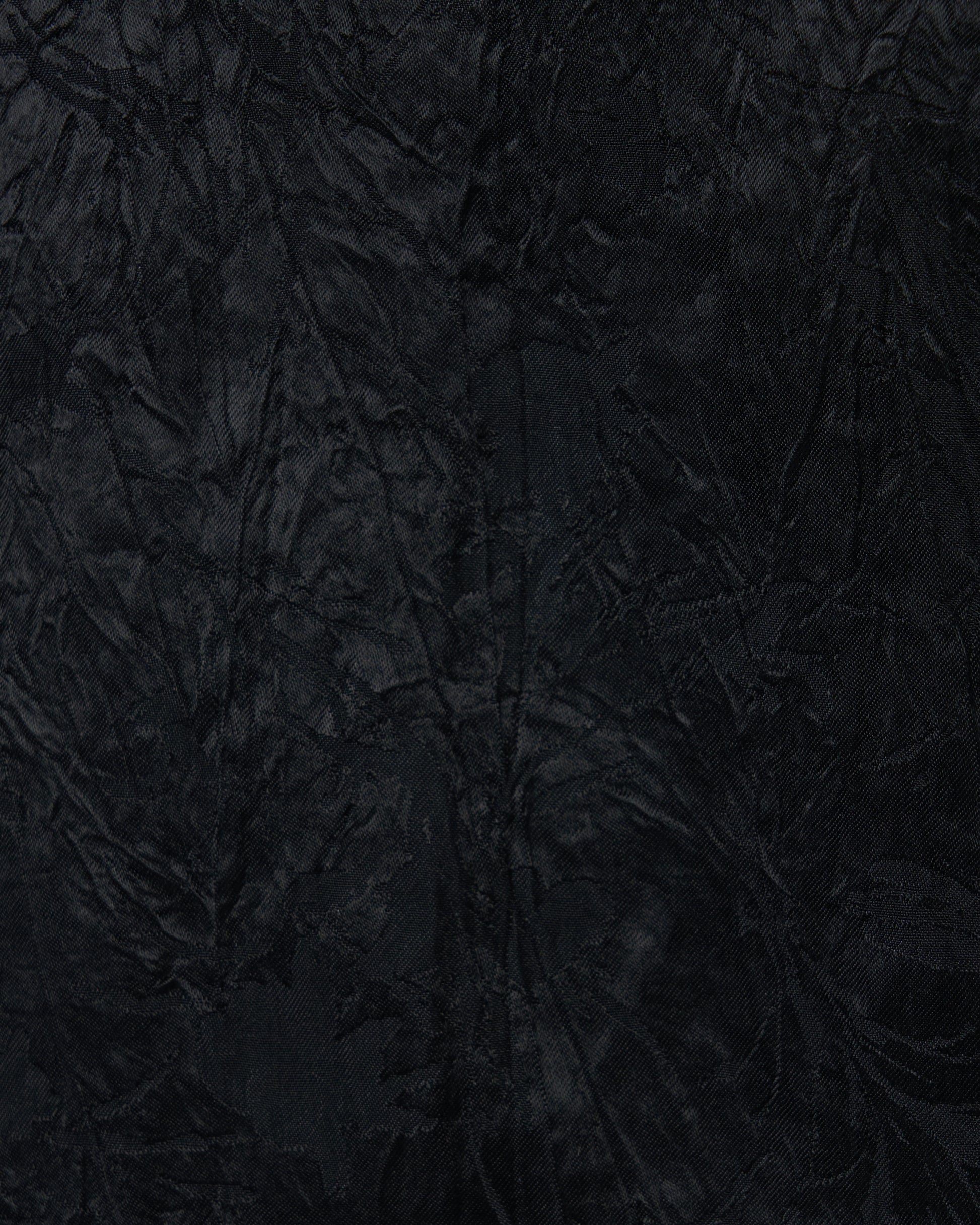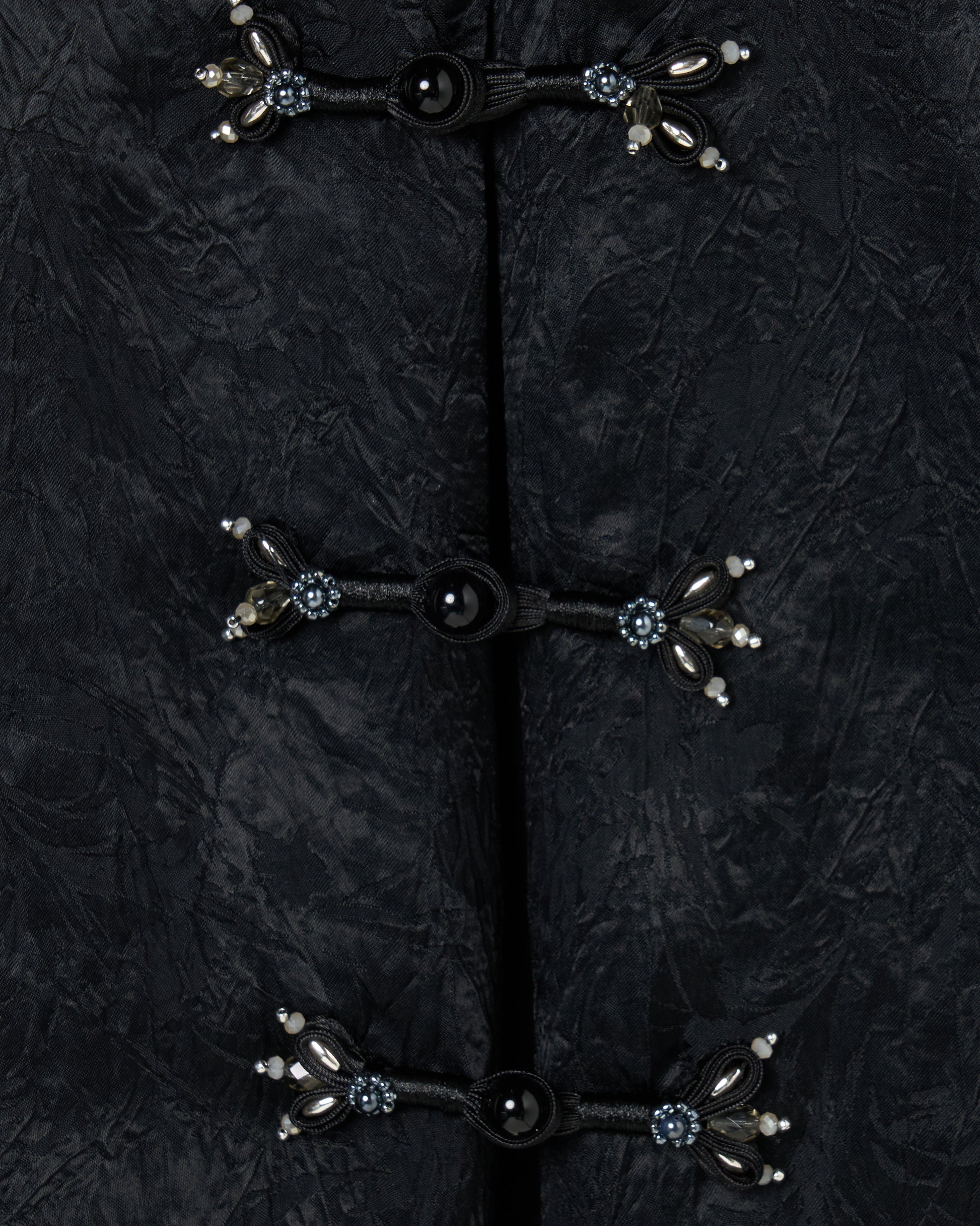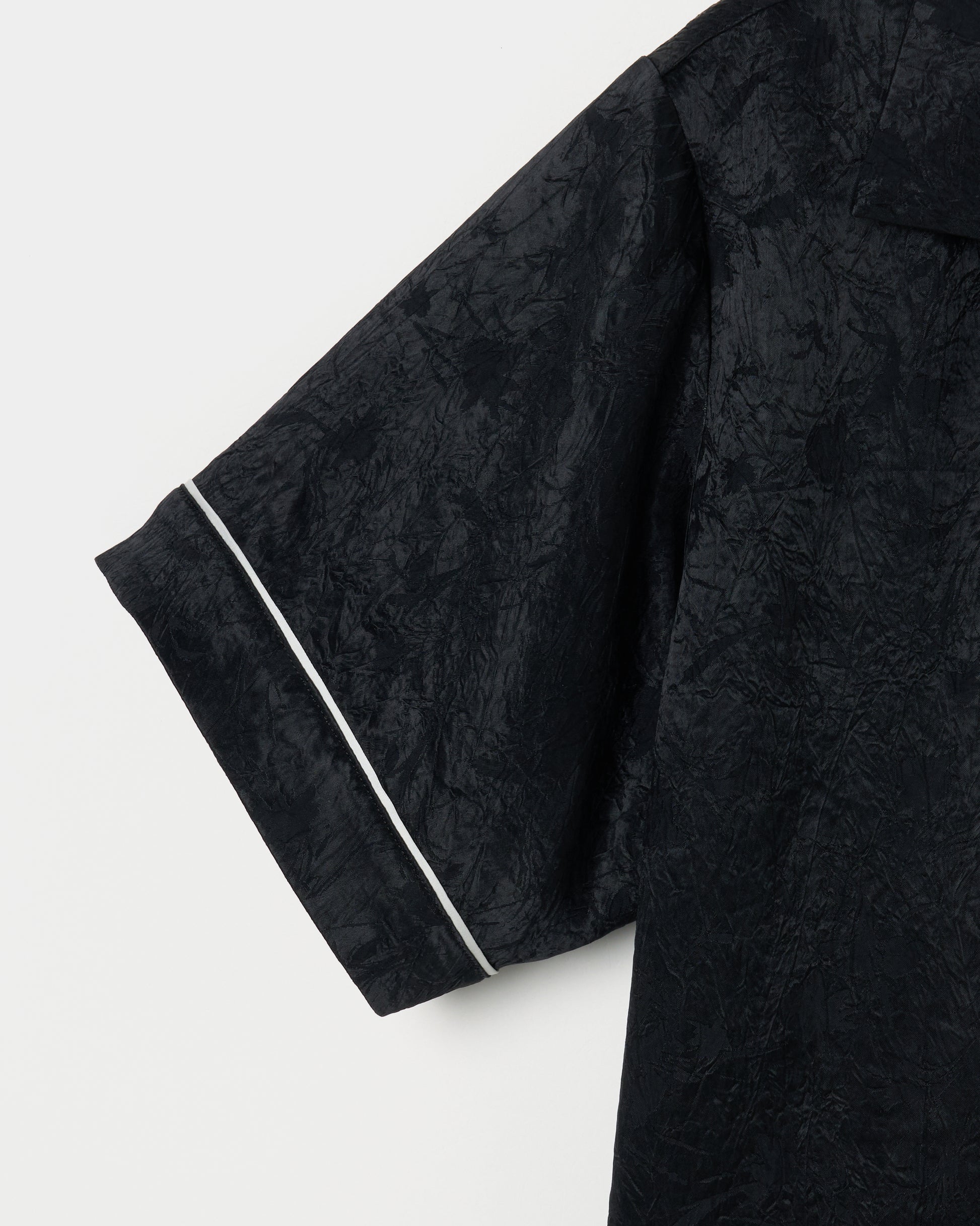 ・ボタニカル柄のサテンをオープンカラーのシャツに仕上げ、チャイナボタンでエキゾチックな雰囲気をプラス。