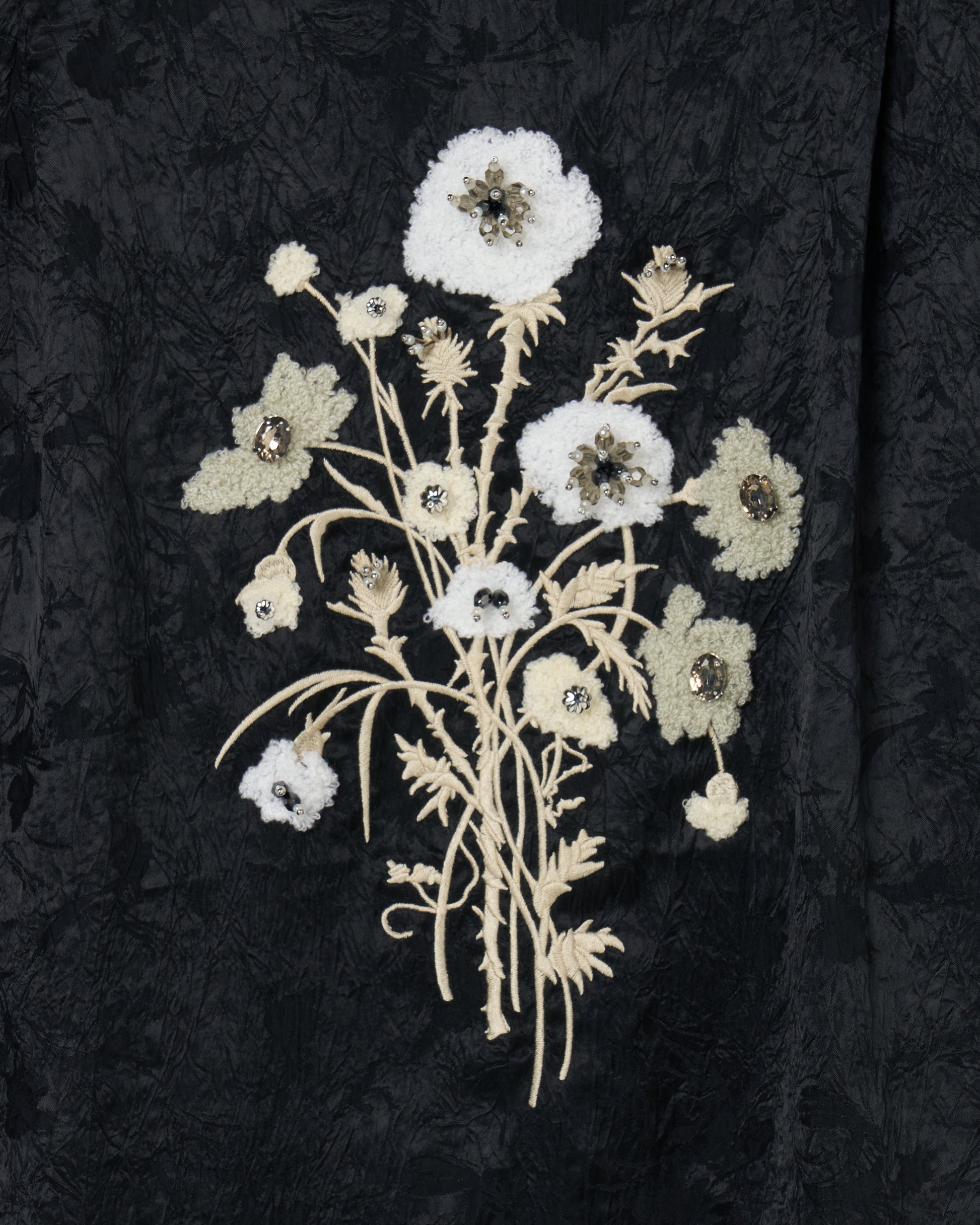 ・背中には咲き乱れる野生の花たち。そこにtanakadaisukeらしいビジュー刺繍で息を吹き込みました。